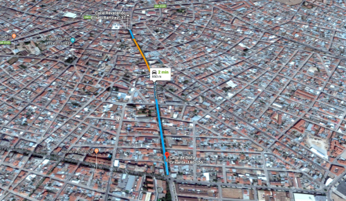 Actualmente se denomina con el nombre co-oficial de "Calle Doña Crisanta". Va dende la Calle Belén y hasta la plaza si se tiene en cuenta la parte peatonal, hasta la rotonda ande confluyen Los Paseos, la Ronda y el Carreterín de la Ossa, lo que se conoce tamién como El Barrio El Pilar.